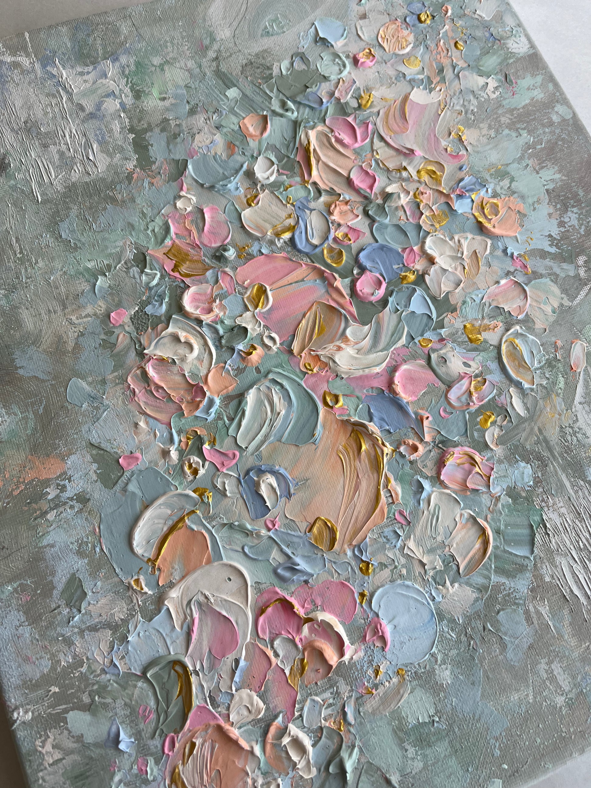 A soothed blend of pastel floral textures in sage and peach pink - calming, gentle, dreamlike cascade of soft colors.